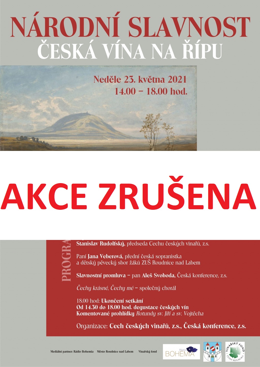 Z důvodu přetrvávajících protiepidemických opatření Cech českých vinařů zrušil svou kulturní akci Česká vína na Řípu. Národní slavnost se, ve spolupráci s Českou konferencí z. s. a českými vinaři, měla konat tuto neděli 23. května 2021. Děkujeme za váš zájem.
