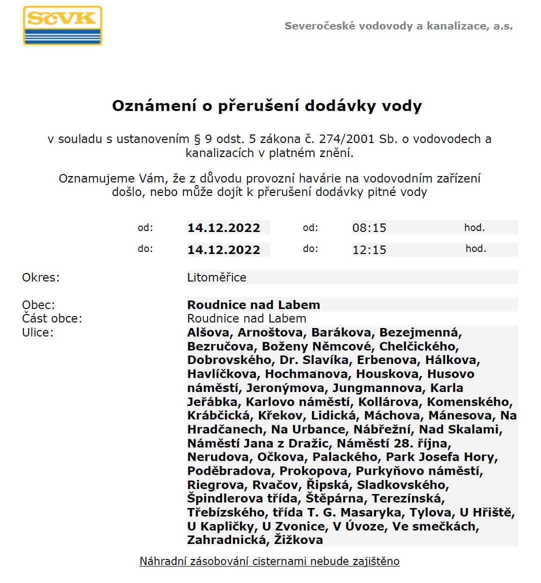 Severočeské vodovody a kanalizace dnes ráno oznámily provozní havárii na vodovodním přivaděči ze Slavína. Z toho důvodu budou po celé dopoledne bez náhrady přerušeny dodávky vody ve větší části Roudnice nad Labem. Děkujeme za pochopení a trpělivost.