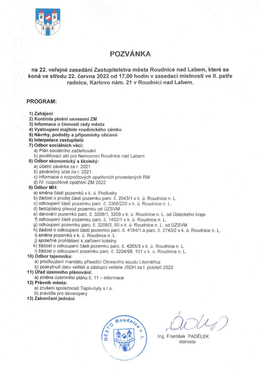 POZVÁNKA NA ZASEDÁNÍ ZASTUPITELSTVA MĚSTA ROUDNICE NAD LABEM