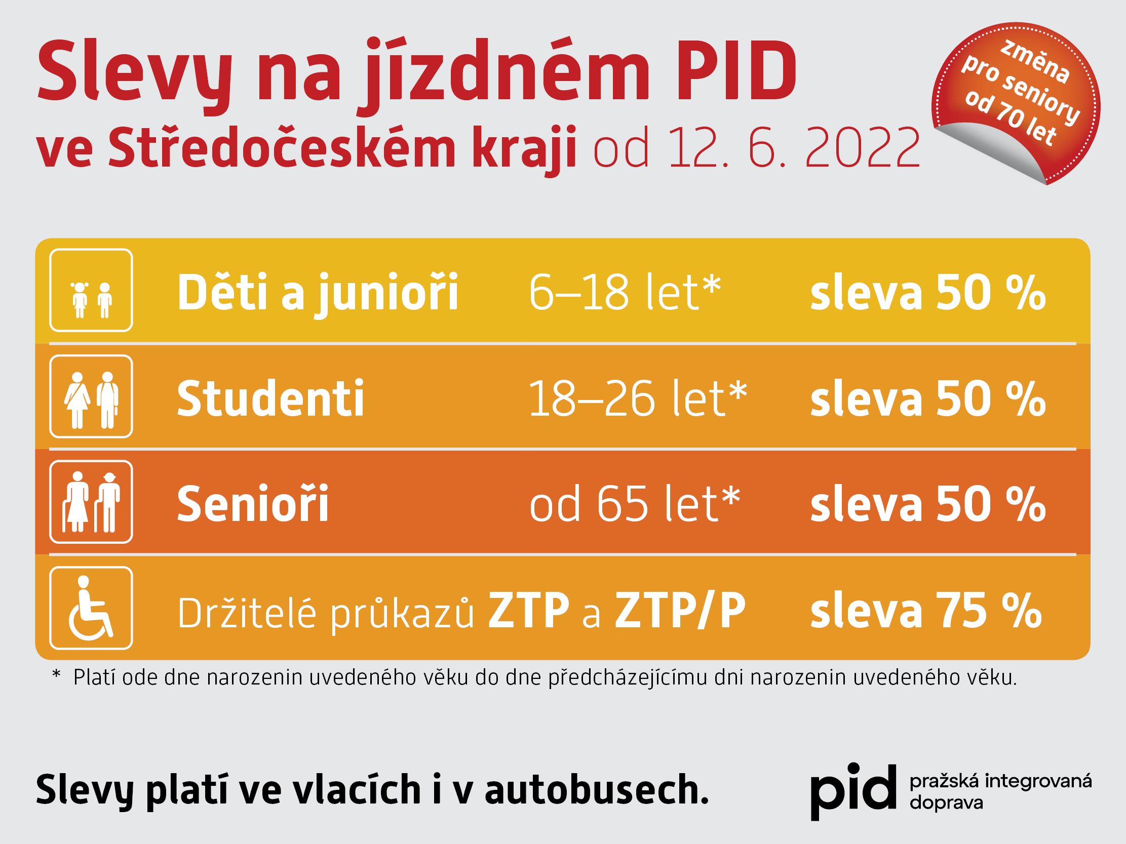 Senioři nad 70 let již nebudou moci cestovat na území Středočeského kraje v autobusech zdarma, ale nově budou platit jak v autobusech, tak i ve vlacích PID poloviční jízdné, stejně jako nyní senioři nad 65 let. K dispozici budou jednorázové i dlouhodobé předplatní jízdní doklady. V Praze se výše ani rozsah slev nijak nemění.