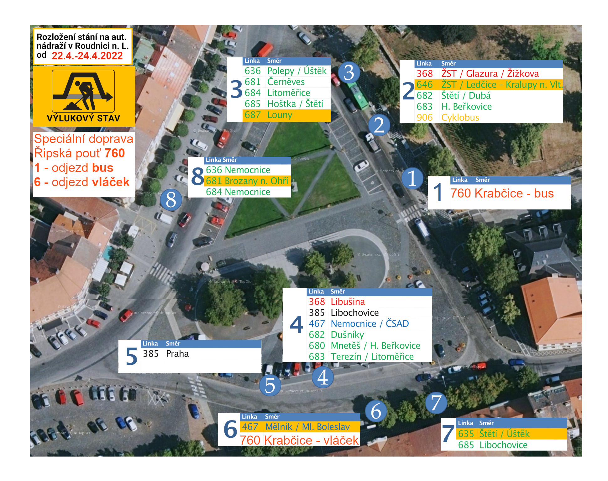 Pro obě dopravy platí pouze nástup v zastávkách ve směru do Krabčic a pouze výstup ve směru do Roudnice nad Labem.