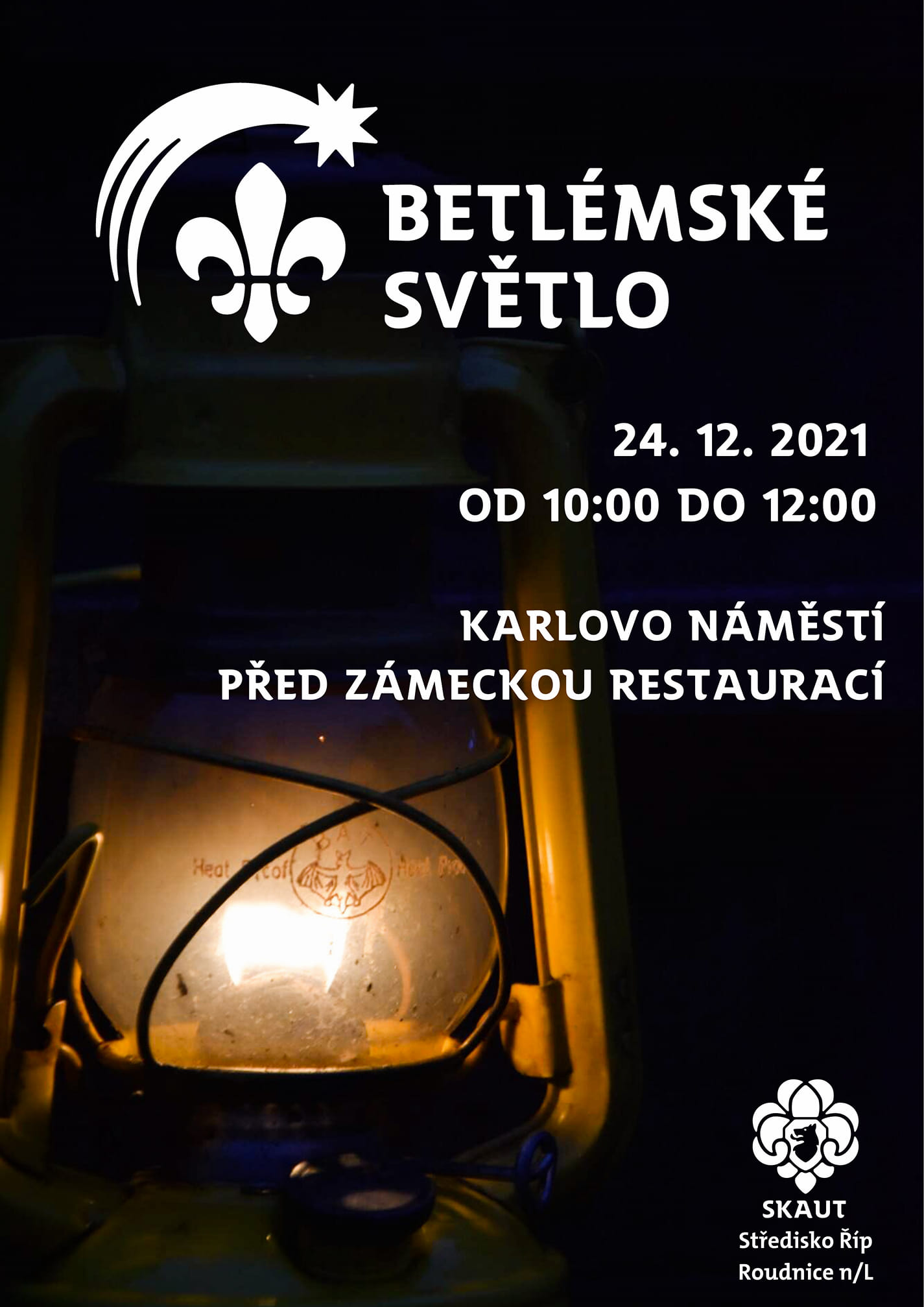 Betlémské světlo je plamínek, který putuje napříč Evropou, symbol míru a přátelství. Skautští kurýři ho každoročně rozváží a roznáší po celém Česku – Betlémské světlo je předvánoční služba skautů společnosti. Na nádraží v Roudnici nad Labem přijede vlakem již v sobotu 18. 12. v 11:43. Zde ho převezmou členové Skautského střediska Říp a budou ho opatrovat až do Štědrého dne. Pokud si chcete světélkem projasnit i váš domov, určitě nezapomeňte přijít v pátek 24. 12. mezi 10. a 12. hodinou na Karlovo náměstí k Zámecké restauraci. Těšit se můžete i na tradiční rybí polévku, na které si nejen pochutnáte, ale dobrovolným příspěvkem opět podpoříte dobrou věc.