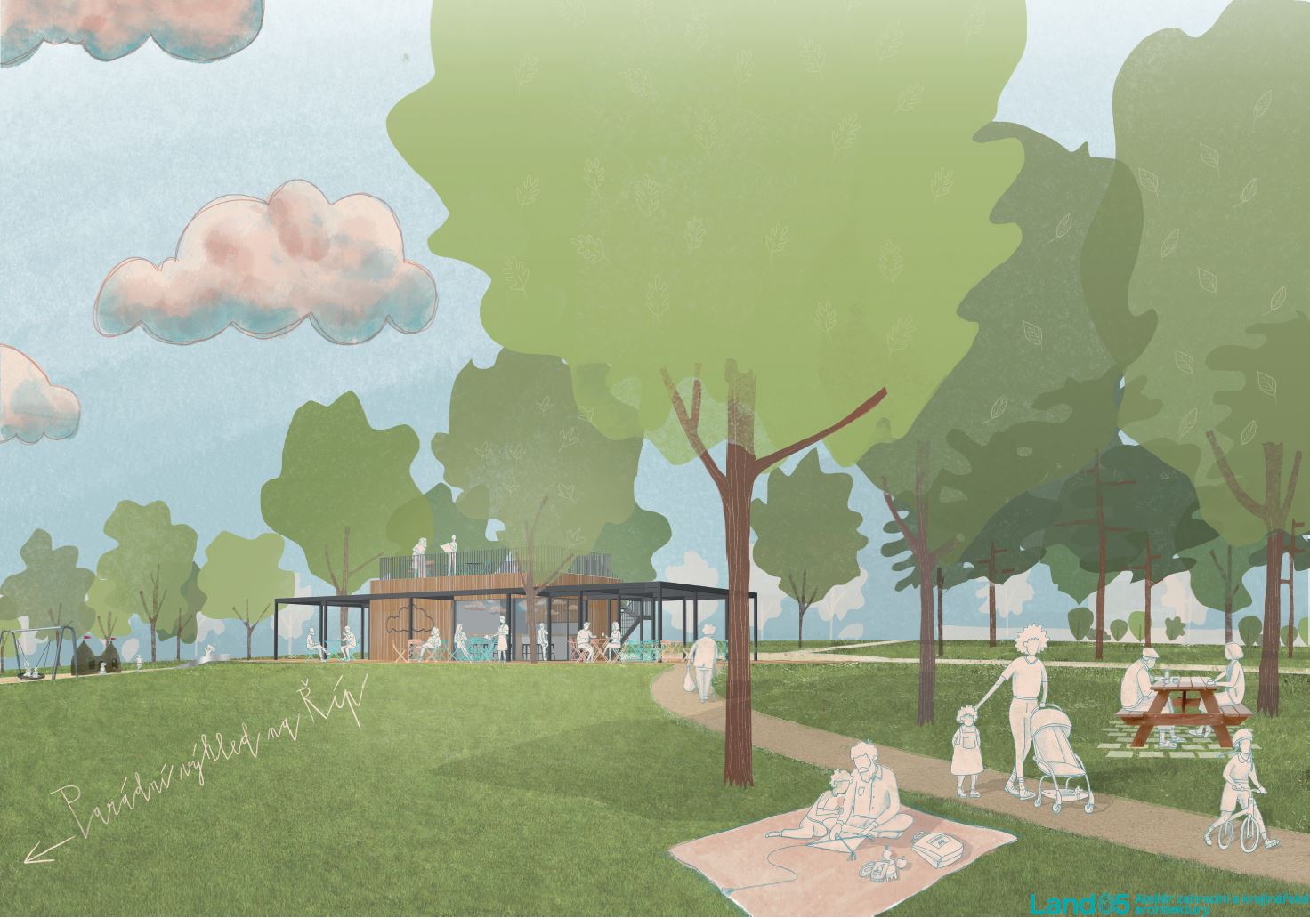 „Místní název Na Kolečku láká k propsání kolečka do půdorysu návrhu. Kolečko uvidí hlavně letci z nedalekého sportovního letiště, ale čistou travnatou plochu tohoto tvaru využijí všichni: k pikniku na louce, k pouštění draků nebo v zimě k sáňkování. Tato volná plocha nabízí mnoho možností a zároveň mezi stromy vymezuje hlavní pohled na horu Říp, který samozřejmě chceme podtrhnout. Kolečko zdůrazníme cestou, která bude vybízet k procházkám a ze které bude mít člověk stále přehled o dění v celém parku. Trasa cesty však záměrně tvar kolečka porušuje, protože se nám do návrhu propisují i oblaka roudnického malíře Otakara Nejedlého. Oblaka zaplní i nebe – strop kavárny a celkově se kavárna bude pomyslně vznášet na obláčku, nejvyšším místě parku.