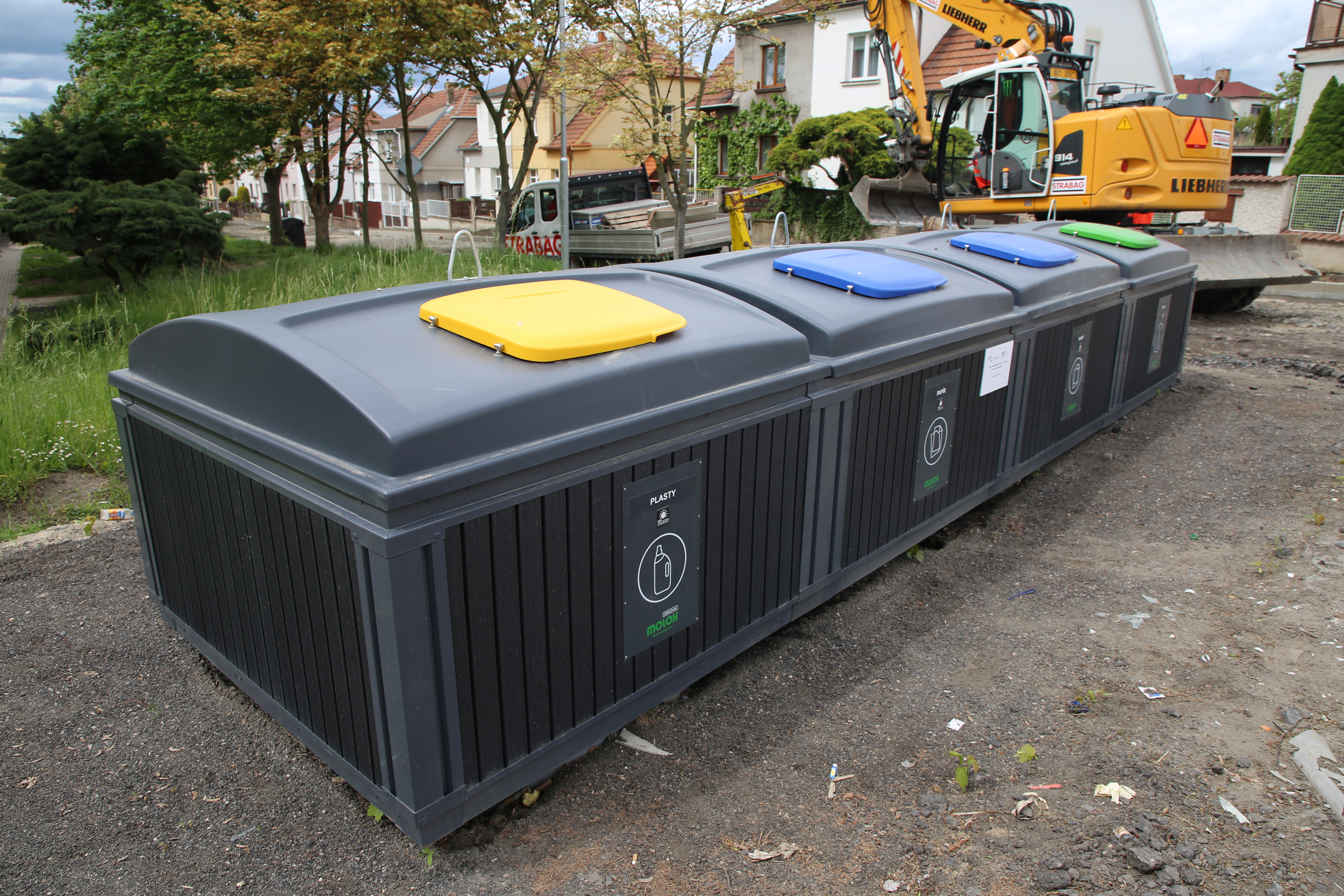 Opět byl zvolen již ověřený systém Molok. Čtveřice nádob, při vývozu vyzdvihovaná zvedacím zařízením, nabídne nadstandardní prostor pro papír (2x 5 m3), sklo (3 m3) a plast (5 m3). Konstrukce a mechanismus kontejnerů je navržena na desítky let provozu. Design zevního obalu je identický s dříve umisťovanými v Podluskách, Hracholuskách či právě realizovaným stanovištěm v Hakenově ulici. Zakázka o celkové ceně 430 810 Kč vč. DPH byla realizována firmou STRABAG, a.s. Dlažba v jejich okolí bude dokončena společně s kompletní rekonstrukcí Švermovy ulice. Tento projekt byl ze 70% spolufinancován Ústeckým krajem.