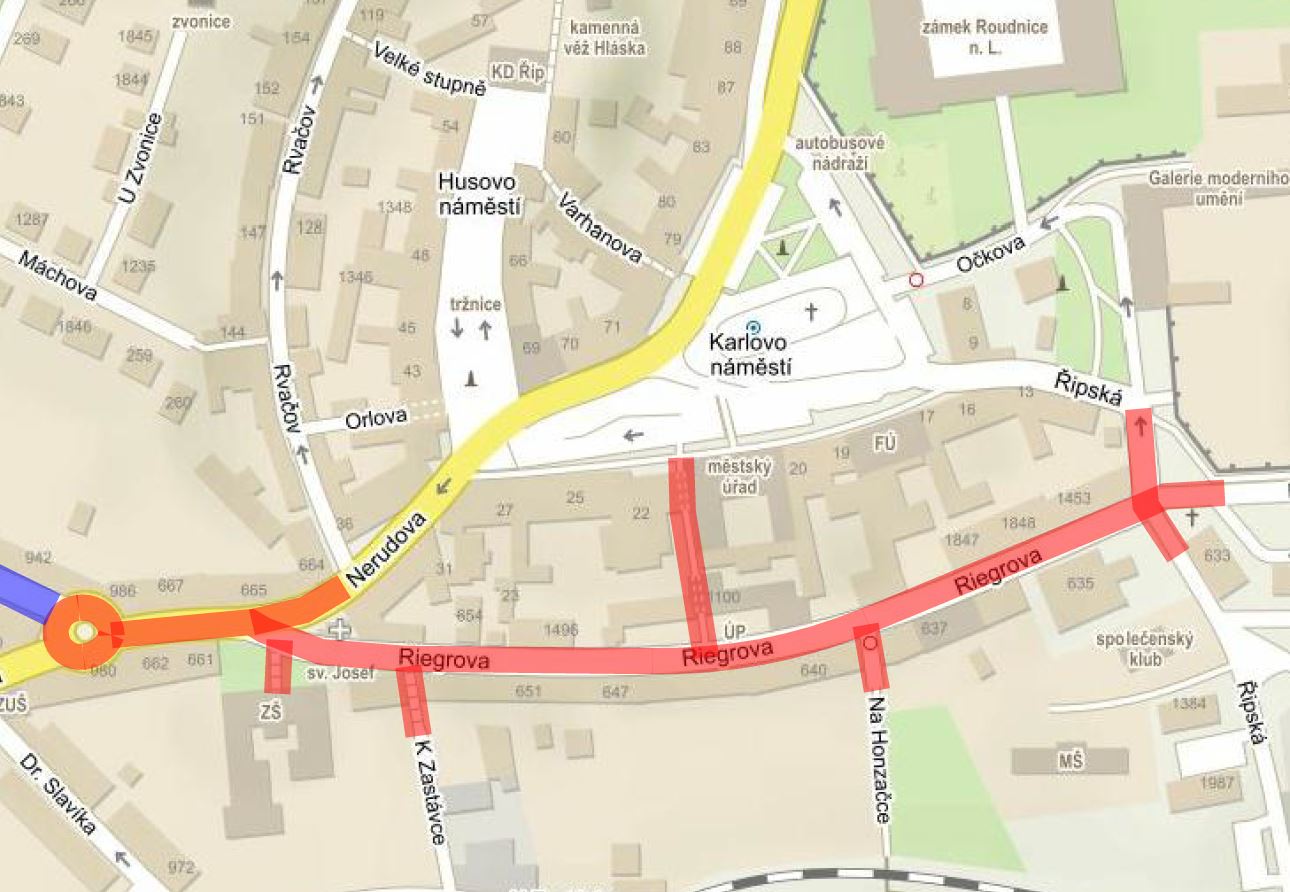 Město Roudnice nad Labem na přípravách s SVS intenzivně spolupracuje, i přesto však budou dopady na dopravní situaci v centru města nevyhnutelné. Riegrova ulice, komunikace, kterou využívá snad většina místních, tak bude až půl druhého roku z větší části uzavřena a po dobu průběhu prací většinou neprůjezdná. Náhradní trasy budou včas vyznačeny a zveřejněny. Návazná rekonstrukce přinese ulici nejen novou vizuální podobu, ale především i dopravní prvky přispívající k bezpečnosti a plynulosti pohybu touto páteřní komunikací. Po kompletním dokončení výkopových prací zahájíme v křižovatce ulic Masarykova a Jungmannova. Dočasný kruhový objezd, vyznačený pouze dopravními prvky, bude nahrazen stavebním středem. V místě přechodu mezi ZŠ Jungmannova a DDM Trend dojde ke vzniku zvýšené nájezdové plochy s cílem zklidnění dopravy mezi těmito školskými zařízeními. S bezpečností žáků souvisí i posun oplocení v celé délce před školou tak, aby mohlo dojít k rozšíření chodníku. To umožní i přesun přechodu z místa vyústění východu úzké uličky za kapličkou do prostoru před stávajícím schodištěm vedoucím do školní budovy. Tato změna umožní v původním místě vytvoření zálivů pro krátkodobé stání, tzv. K+R, kde budou moci rodiče žáky bezpečně vysadit z automobilů, aniž by přitom blokovali ostatní dopravu. Dělící ostrůvek bude jasně definovat nutný pohyb vozidel při odbočení z náměstí do ulice Riegrova, přičemž nadměrnější vozidla, jako jsou autobusy a nákladní vozy, se budou otáčet na zmíněné malé okružní křižovatce.