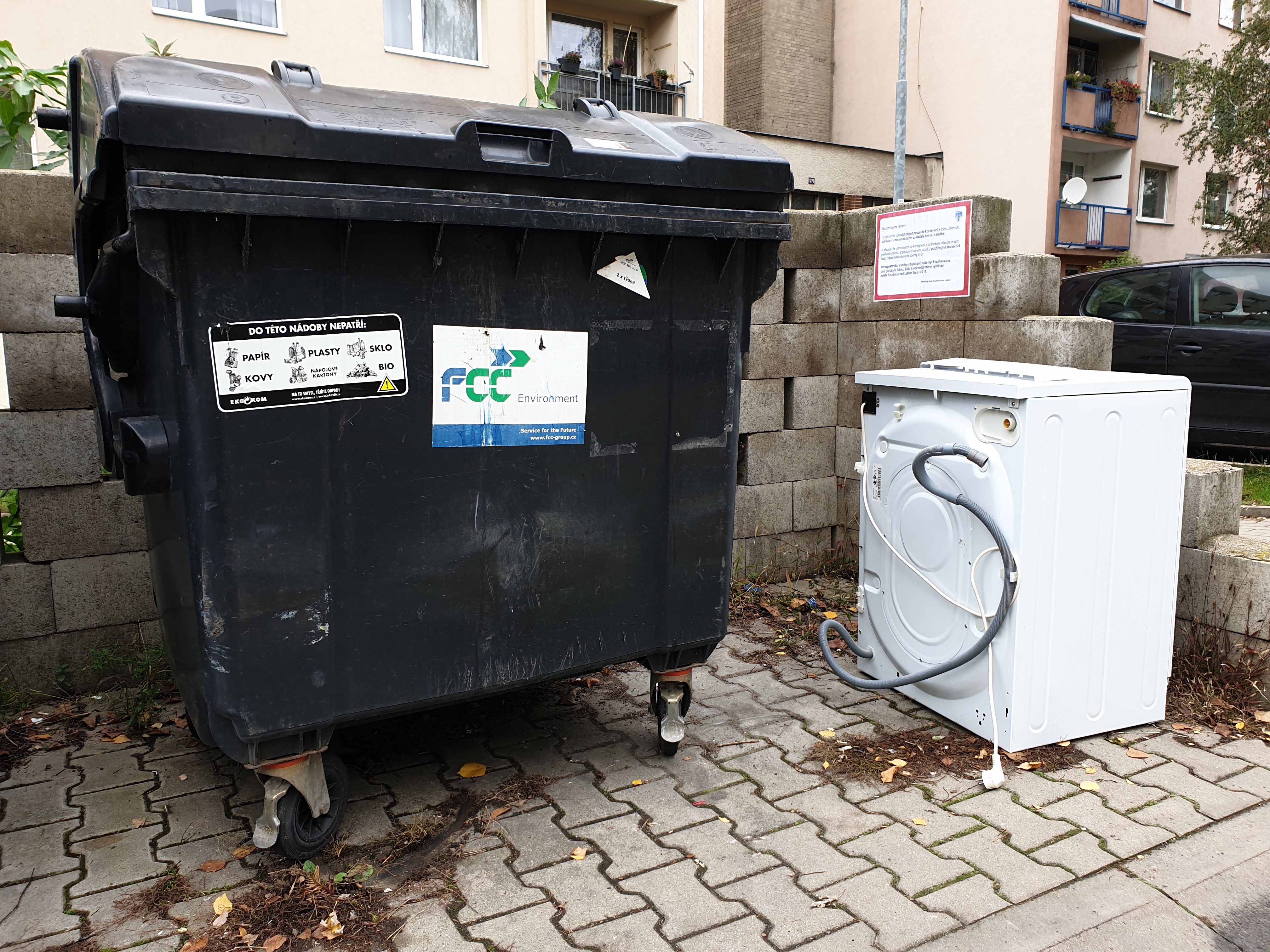 (pračka odstavená přímo pod plakátem upozorňujícím na zákaz odkládání odpadu patřícího na sběrný dvůr)