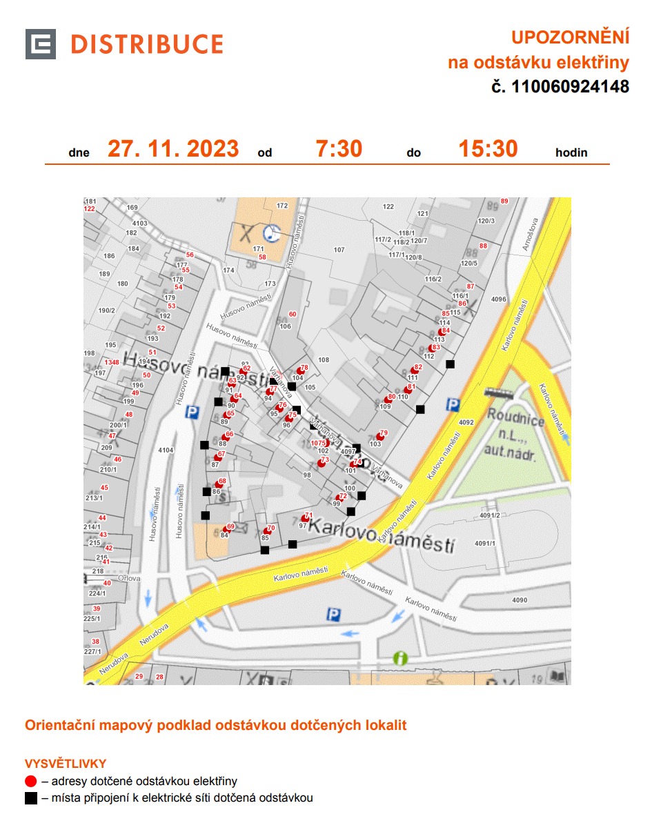 V pondělí 27. listopadu dojde v centru města k plánované odstávce elektřiny. Důvodem je přepojení čtyřech rozvodných skříní, související s probíhajícími pracemi na posílení rozvodů nízkého napětí. Firma R-built v tomto dni posílí pracovní skupiny tak, aby vše stihla dokončit v co nejkratším čase.