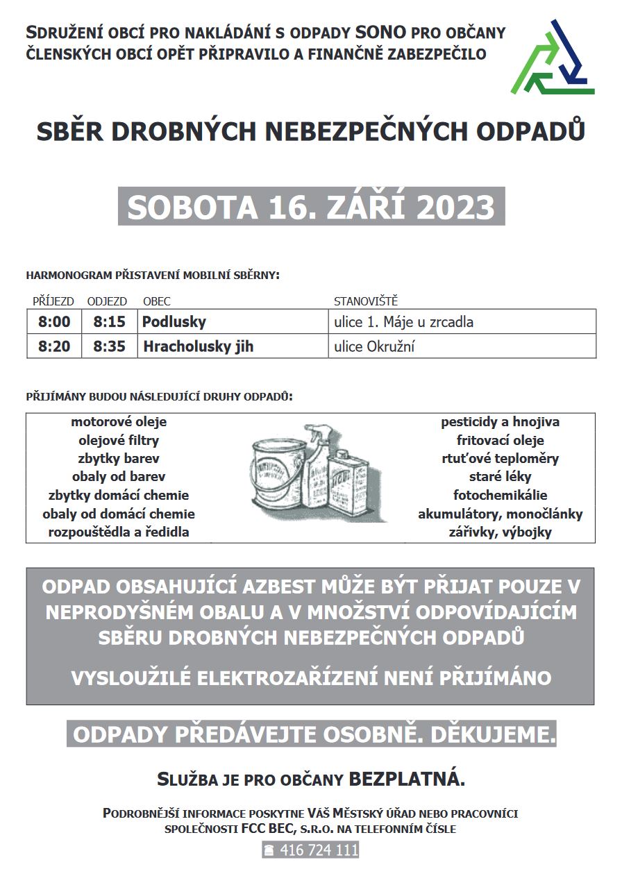V sobotu 16. září ráno v Podluskách a na sídlišti Hracholusky JIH proběhne sběr drobných nebezpečných odpadů. Do mobilní sběrny můžete zdarma odevzdat např. motorový olej, zbytky barev či domácí chemie, staré léky či akumulátory. Televizory, monitory, lednice, mrazáky ani další domácí spotřebiče a ostatní elektrozařízení však přijímány nejsou! Službu zabezpečuje Sdružení obcí pro nakládání s odpady SONO.