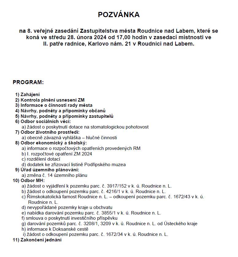 POZVÁNKA NA ZASEDÁNÍ ZASTUPITELSTVA MĚSTA ROUDNICE NAD LABEM