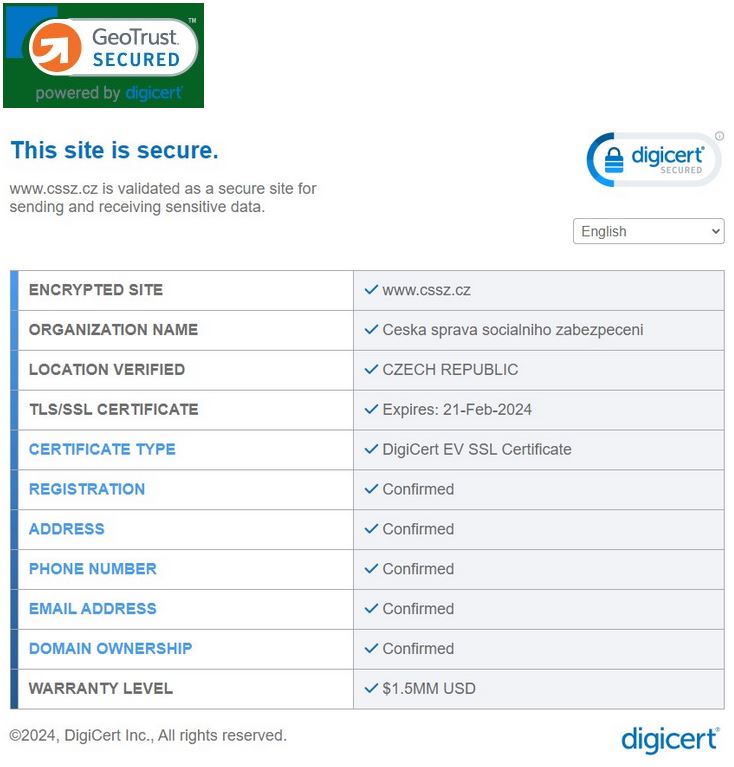 Jediné oficiální stránky ČSSZ jsou www.cssz.cz a eportal.cssz.cz, jejichž bezpečnost garantuje digitální pečeť společnosti DigiCert umístěná na webové stránce vpravo dole. Po kliknutí na pečeť se zobrazí identifikační údaje ČSSZ a návštěvník stránek snadno zjistí všechny informace o majiteli webu.